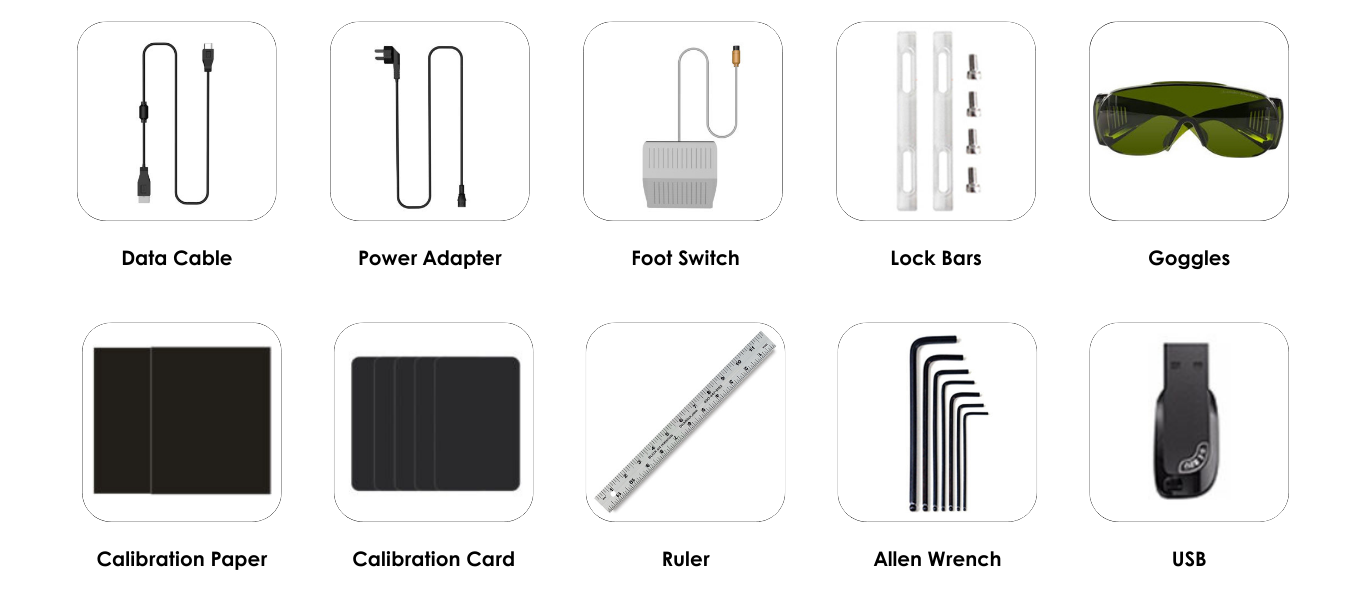 ·Machine ·Data Cable*1 ·Power Adapter * ·Foot Switch * 1 ·Goggles * 1 ·Ruler*1 ·USB (With software)*1 ·Calibration Paper & Card ·Lock Bars & Wrench |